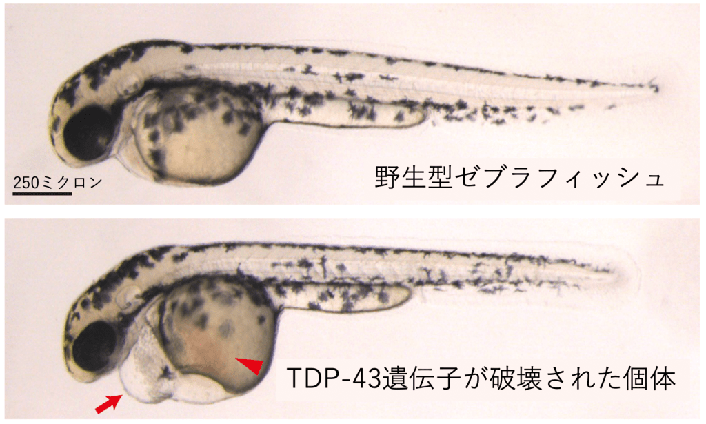 例えば、筋肉の細胞(筋細胞)で、TDP-43の量が少なくなると、加齢に伴う筋力の低下が加速することが、マウスや昆虫を使った研究から明らかになっています。また、ゼブラフィッシュという熱帯魚を使った研究では、TDP-43の量が少なくなると、筋細胞の形や機能が徐々に失われてしまうことが報告されています。