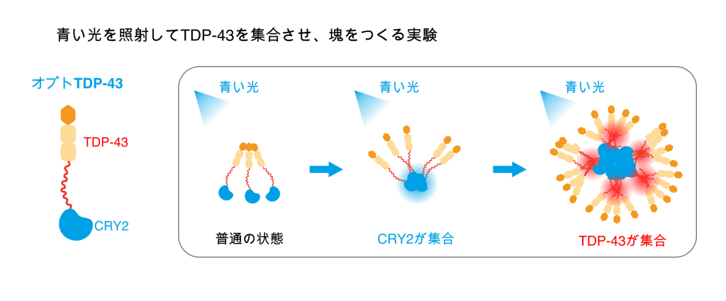 青色光を吸収すると自己会合する光遺伝学型TDP-43(オプトTDP-43)は、通常条件下では細胞核に豊富にありますが、青色光を照射するだけで細胞質の濃度を増加させます(Asakawa 2020)。この興味深い振る舞いを生み出すTDP-43タンパク質の性質を研究します。TDP-43は、いくつかの機能ドメインが連なったタンパク質ですが、どのドメイン機能が細胞質への移行に関係しているのか、楽しみです。筋萎縮性側索硬化症(ALS)では、TDP-43は細胞質で凝集するので、TDP-43が凝集に向かう初めの段階の仕組みを明らかにできればと思います。