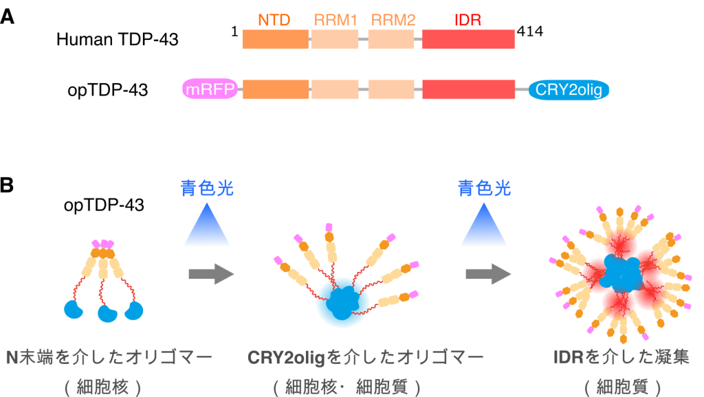 次に筆者らは、TDP-43の細胞内濃度の変動に依存することなく、TDP-43の凝集を誘導する手法の開発を模索した。筆者らが着目したのは、青い光を吸収すると凝集するシロイヌナズナのCryptochrome (CRY2)である。光凝集性を高める変異が導入されたCRY2(Cry2olig)[5]を、天然変性領域(Intrinsically Disordered Region, IDR)が存在するTDP-43のC末端側に融合させた光遺伝学型TDP-43(opTDP-43)を構築した(図2)[1]。TDP-43の凝集には、IDRを介した相転移が重要な役割を担っていると予想し、Cry2oligモジュールが青色光を吸収して集合すると、IDR間の物理的相互作用が促進され、opTDP-43が相転移を起こすのではないか、と考えた。